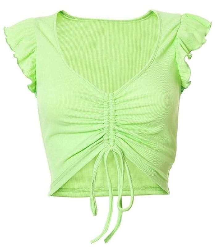 Blusa corta de punto para mujer con ribete de volantes. Un diseño fresco, cómodo y femenino que eleva cualquier look casual con un toque moderno.