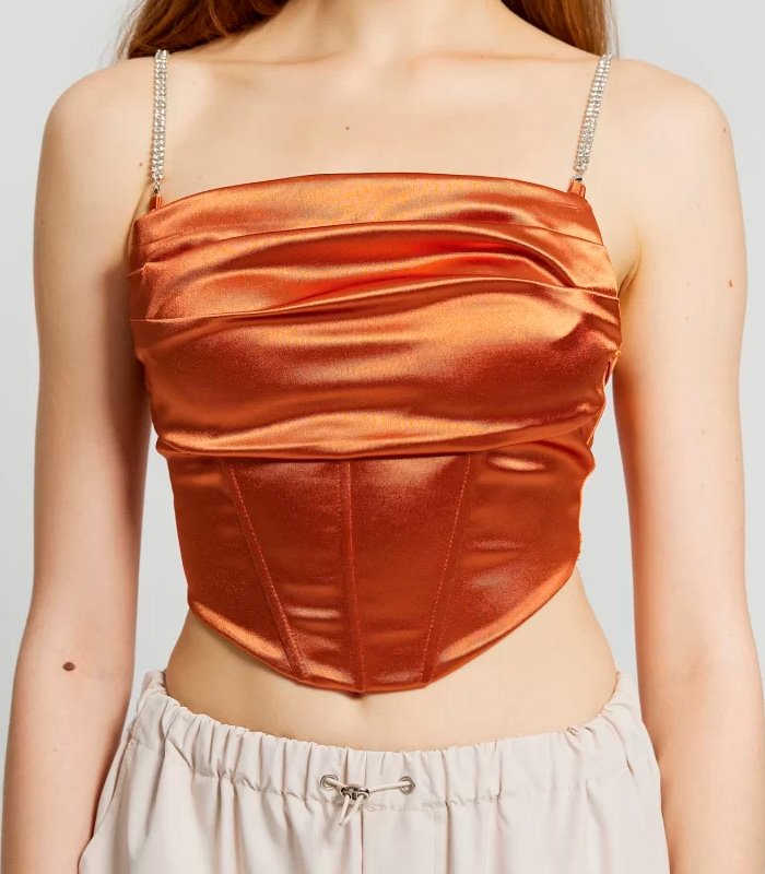 Corsé satén mujer con diamantes de imitación y plisado estilo espina. Ajuste ceñido, sin mangas y acabado brillante. Perfecto para salir y fiestas elegantes.