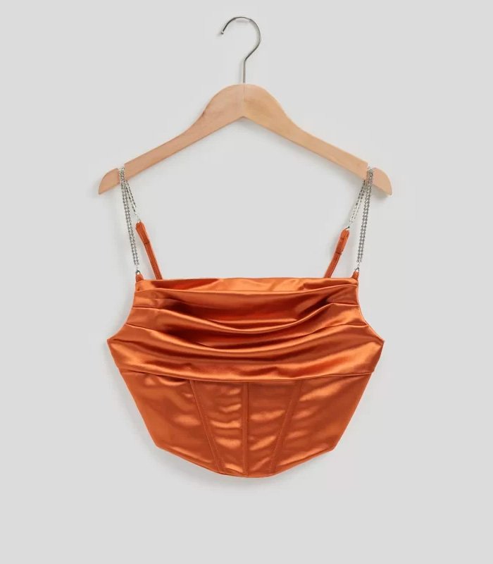 Este corsé de satén de alta calidad realza la silueta con un acabado suave y luminoso. Los diamantes de imitación dispuestos en plisado tipo espina de pescado añaden un toque glam, mientras el corte ajustado y sin mangas estiliza con sofisticación.