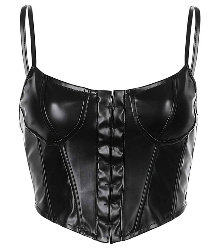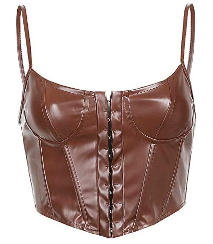 Top sexy de corte bajo para mujer. Diseño tipo corsé en cuero sintético con escote pronunciado. Ideal para vacaciones, fiestas y sesiones de fotografía.