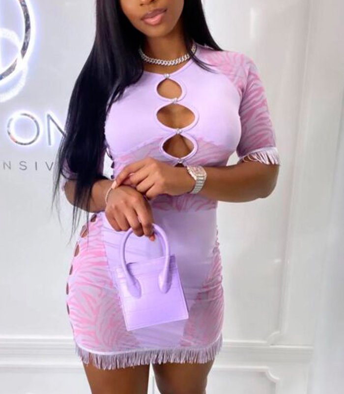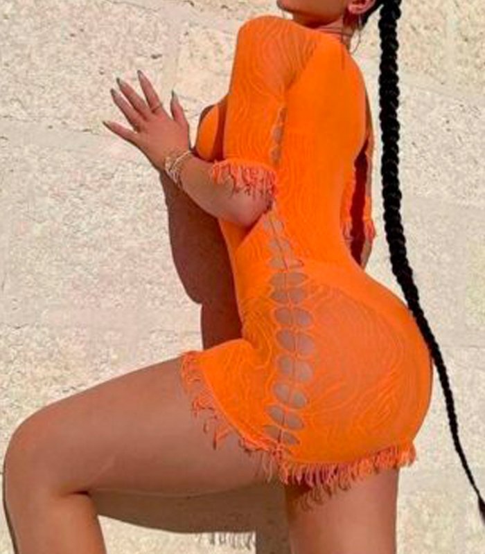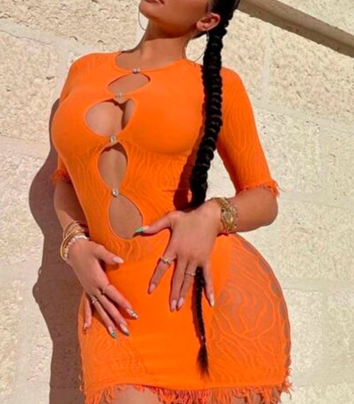 Descubre el equilibrio entre sensualidad y estilo con este vestido de malla transparente para mujer. Su diseño ajustado realza la figura, mientras los recortes y la textura translúcida añaden un toque audaz y sofisticado.