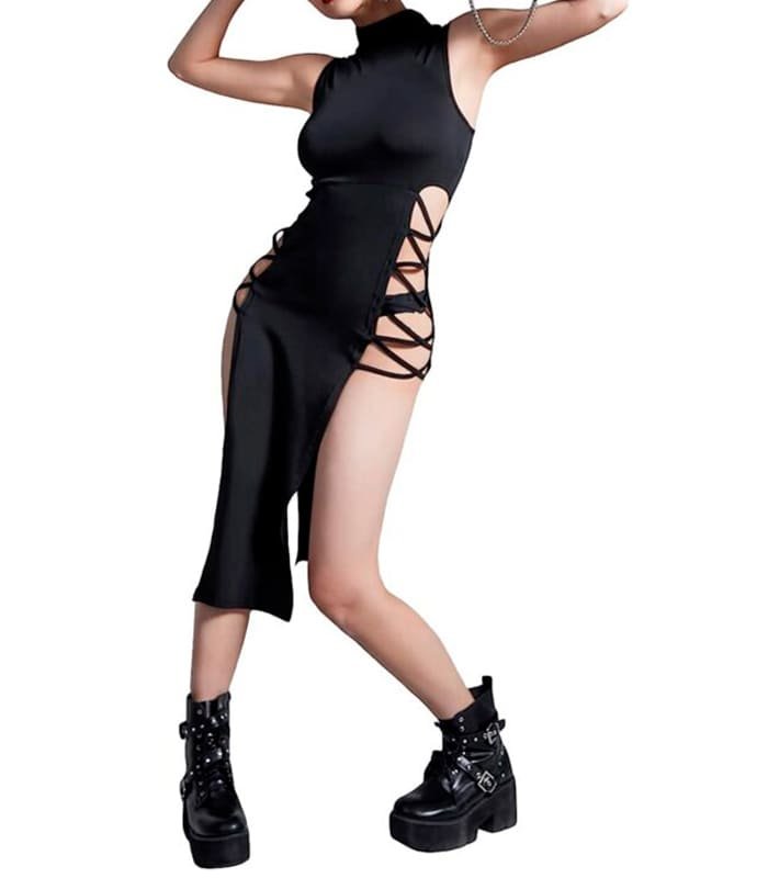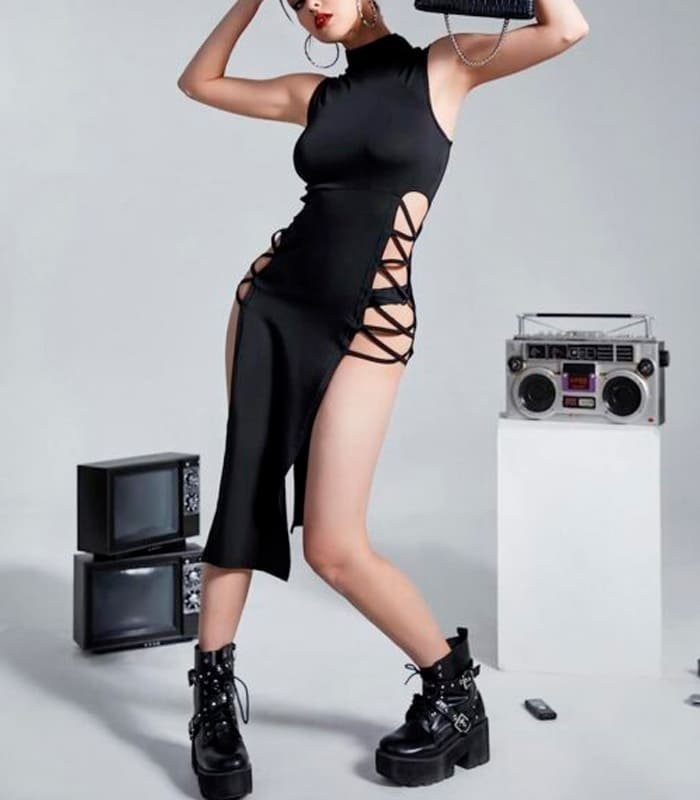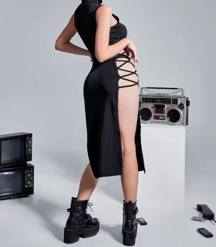Este vestido midi negro combina frescura y elegancia en un diseño moderno y versátil. Con cuello alto, abertura lateral y cordones ajustables, es la opción perfecta para lucir impecable tanto en fiestas como en entornos casuales o de trabajo.